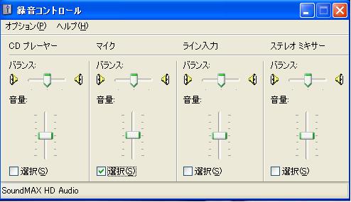 録音コントロールの設定(この時は外部マイク録音のため、マイクにチェック。ステレオミキサー選んでも×、ライン入力にブッ刺して、もちろんライン入力にチェックしても×、録音されないっす・・・('A`))