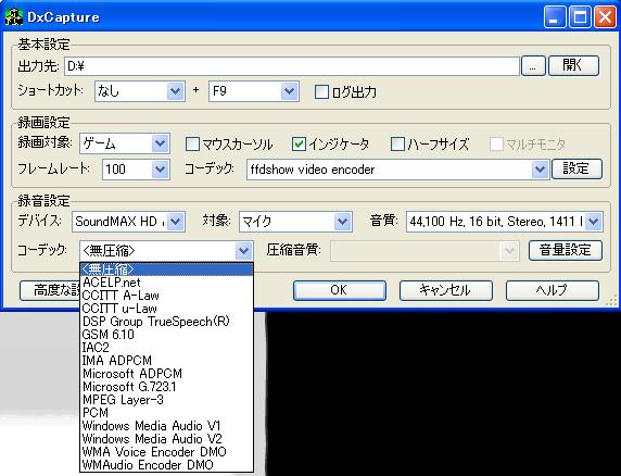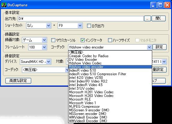 ffdshow video encoder以外のコーデックだと、音はおろか動画自体も撮れない・・・